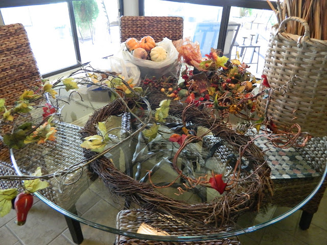 A big tangled mess of garland, odds and ends of fall decor from previous projects, and a very skinny oval twig wreath. I figured if I fooled around with it long enough it had possibilities...