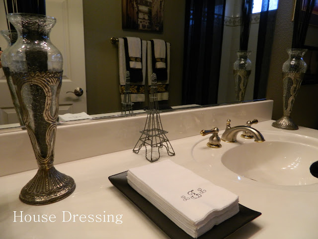 I've been wanting to 'dress-up' the guest bath for awhile, not being one to decorate a room using a theme...mostly because I think they always seem over the top, juvenile and just plain silly, plus... I just don't know how to successfully pull theme decorating off. That being said, I was determined to use this fine art photograph of Paris architecture, as a focal point in what, to most, would seem like an unlikely room to display it, but it IS a room that every guest to our home visits at one time or another, so in my opinion it deserves a nice piece of art.